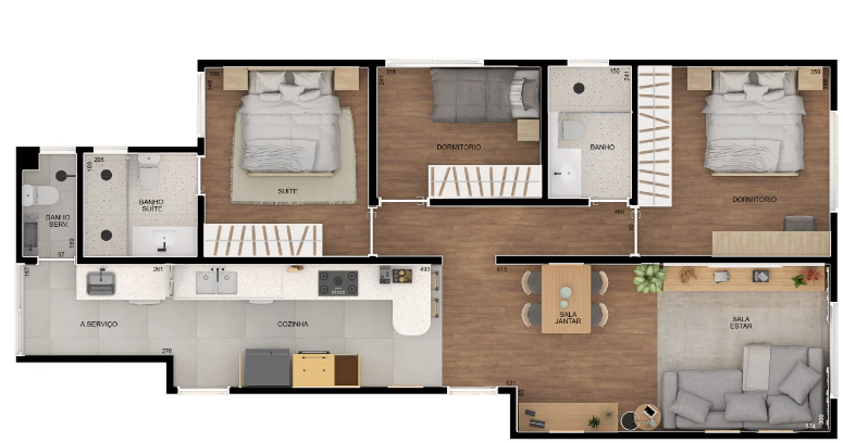 3 dormitórios, sendo 1 suíte